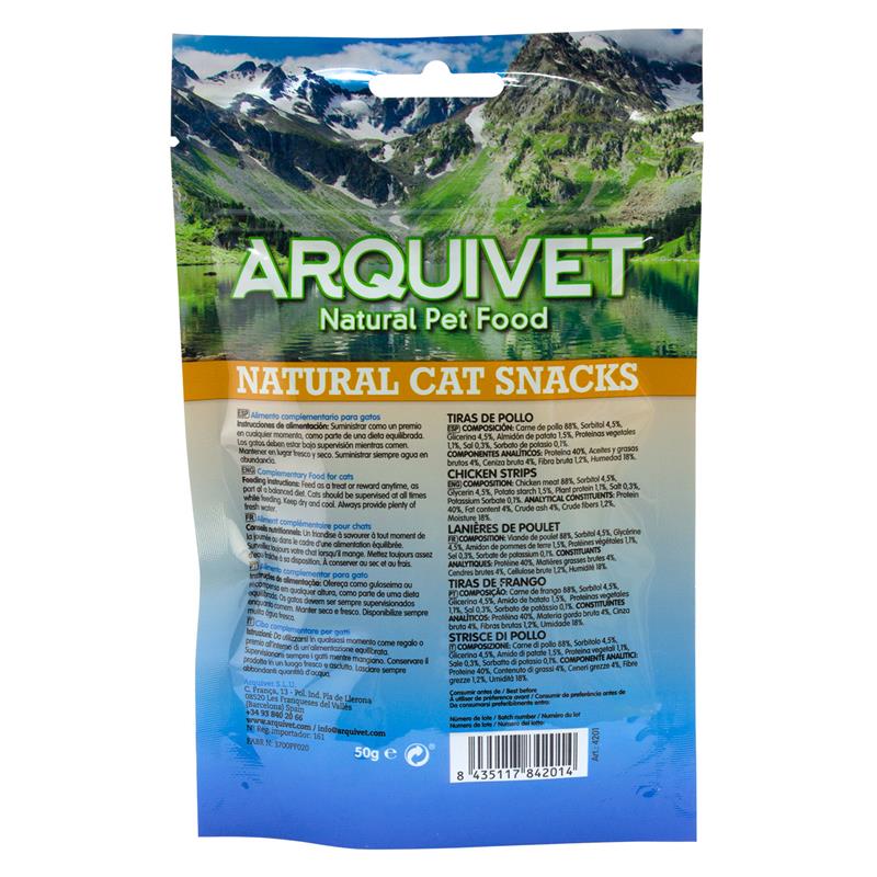 Snack sous forme de lanières, à base de viande de poulet. 100% naturel. Riche en protéines animales et faible en gras (produit léger). Aliment complémentaire pour votre chat, très riche en nutriments.